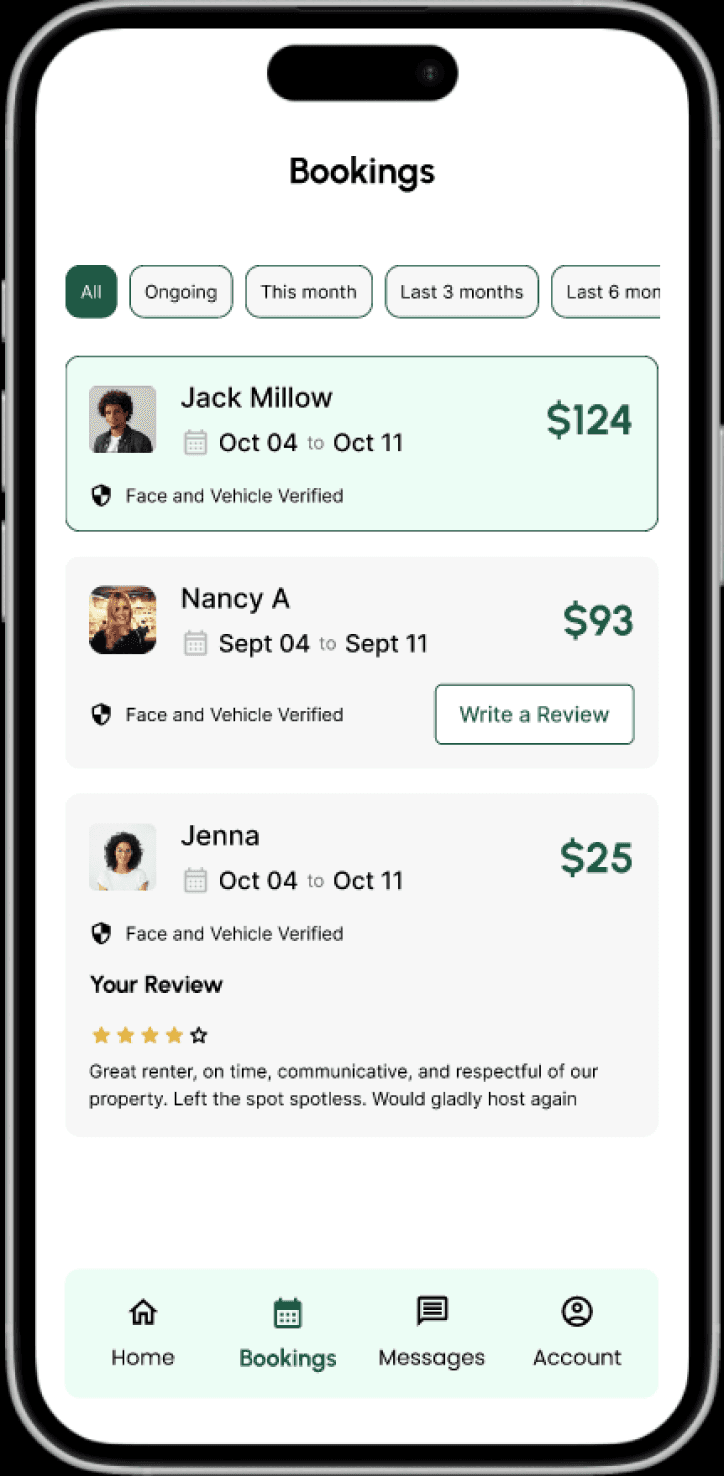 Homeowners who rent out their driveways want to earn passive income without risking their safety, property, or peace of mind. However, current platforms lack renter and vehicle verification, reliable communication, and meaningful support, leaving homeowners exposed to fraud, high risk situations, and unpredictable renter behavior.