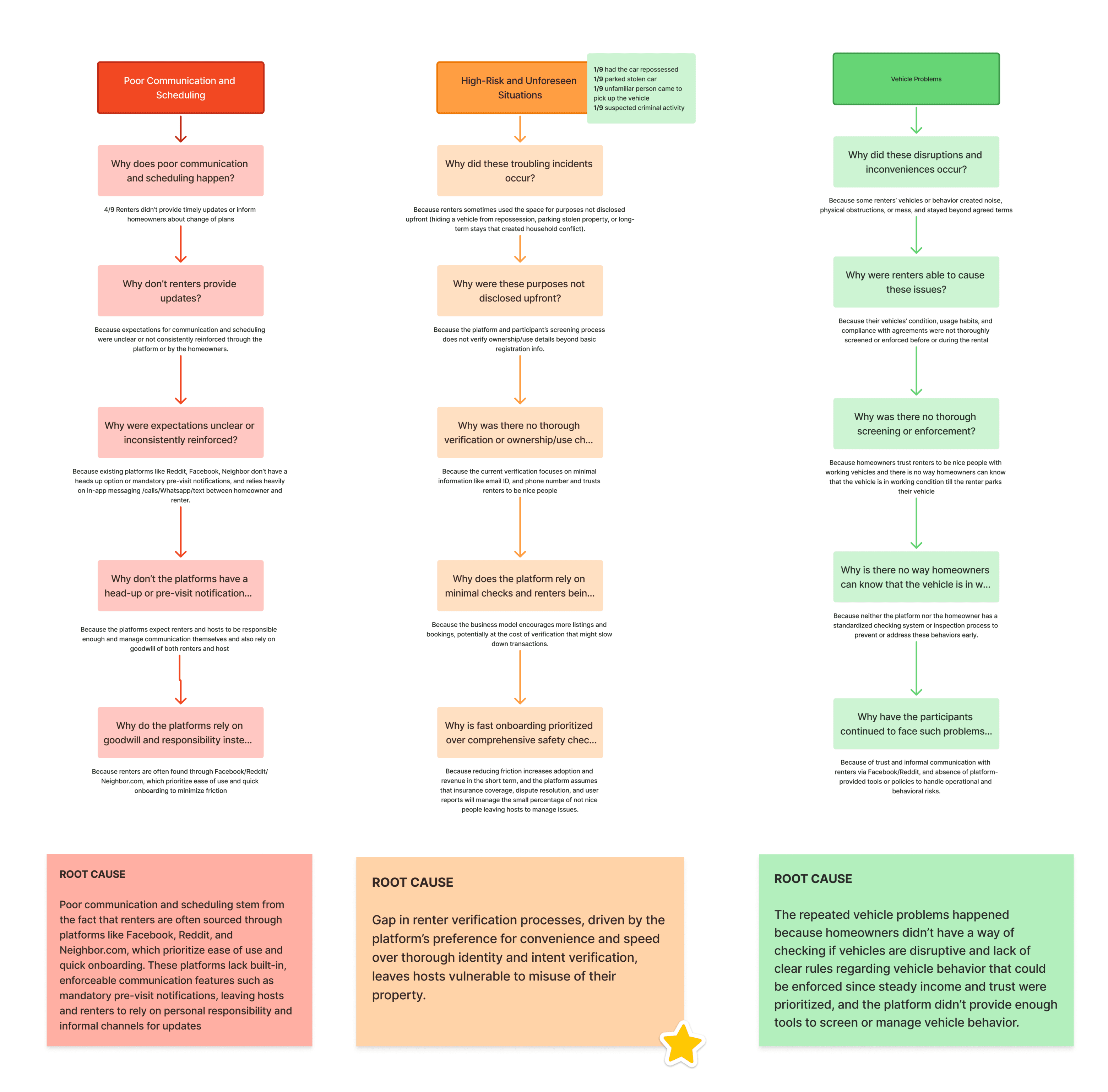 To avoid surface level conclusions, I used the 5 Whys method on major issues like poor communication, vehicle problems, and high risk incidents.