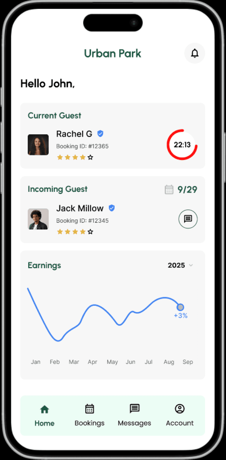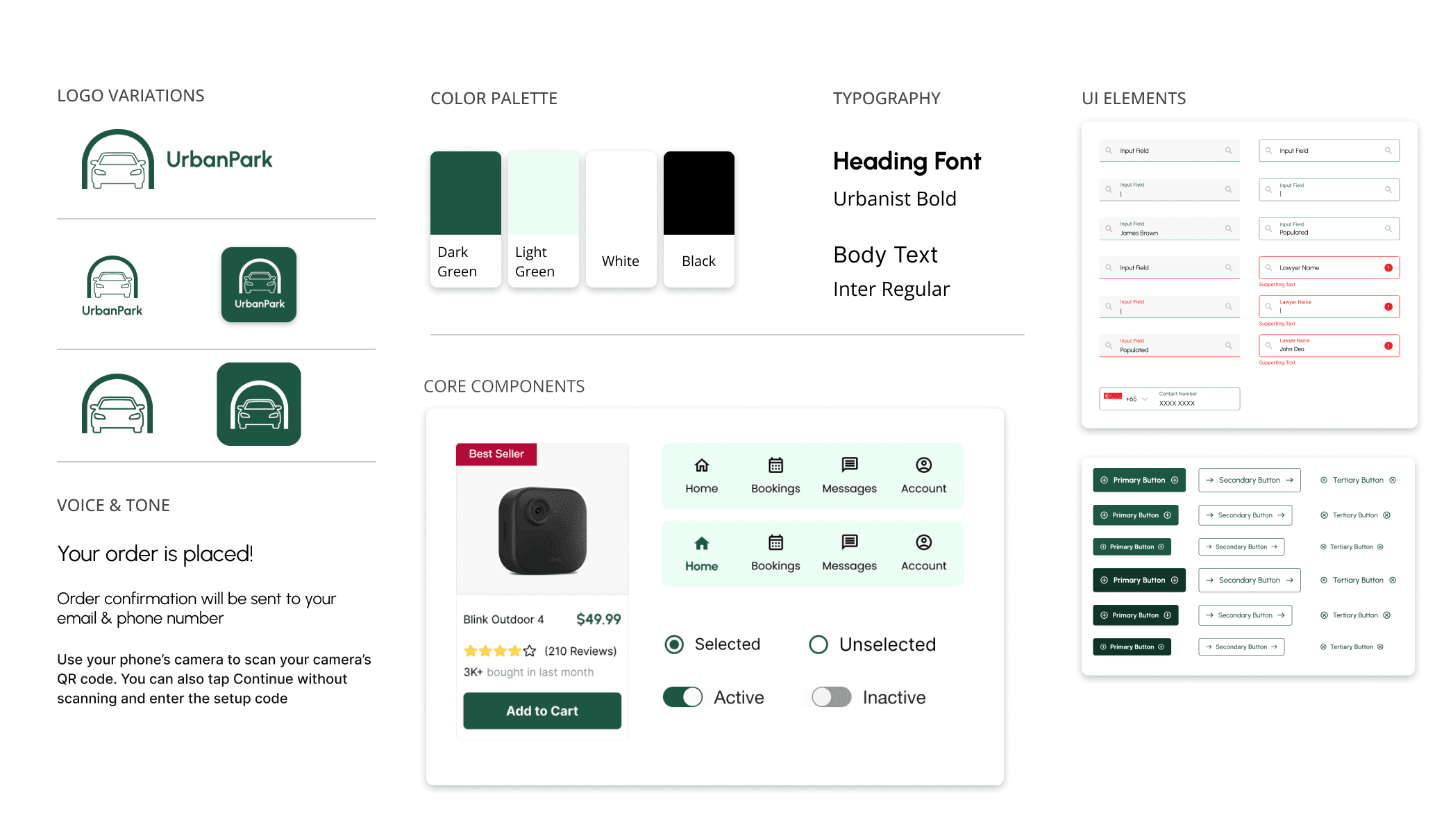 UrbanPark’s branding is built around trust, safety, and approachability. The green color palette represents security, reliability, and calm, helping homeowners feel confident sharing their personal space. The logo combines a car and a driveway arch to symbolize protected parking within a home environment. Rounded UI elements and friendly typography reinforce ease of use and reduce anxiety around renting