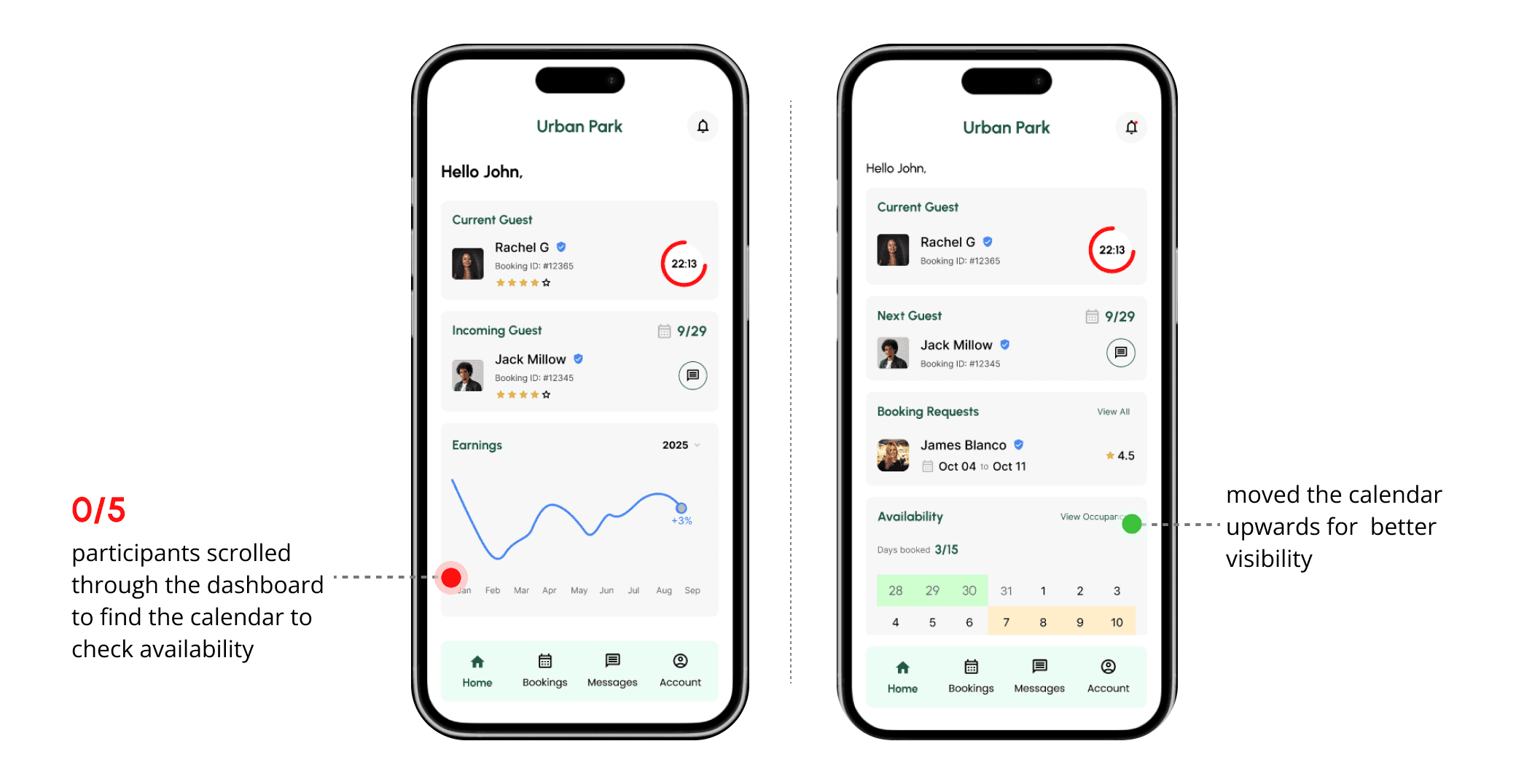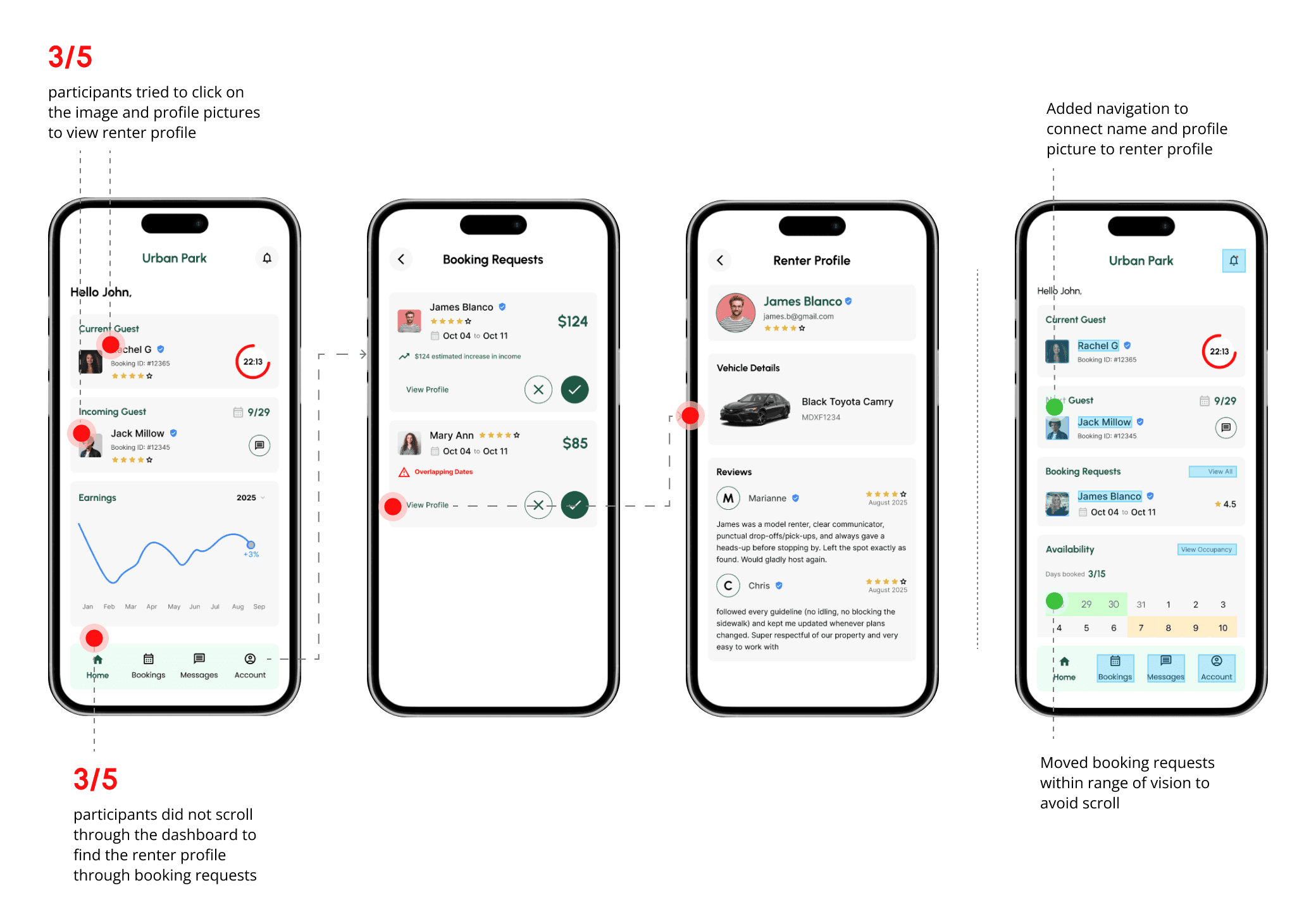 Usability testing was conducted with 5 homeowners who had prior experience renting out their driveways or garages. Participants walked through key flows such as listing a space, reviewing renter details, approving bookings, and understanding verification signals. The sessions helped uncover clarity issues around calendar visibility and renter information access. Insights from these tests directly informed layout refinements and improved information hierarchy to reduce homeowner anxiety