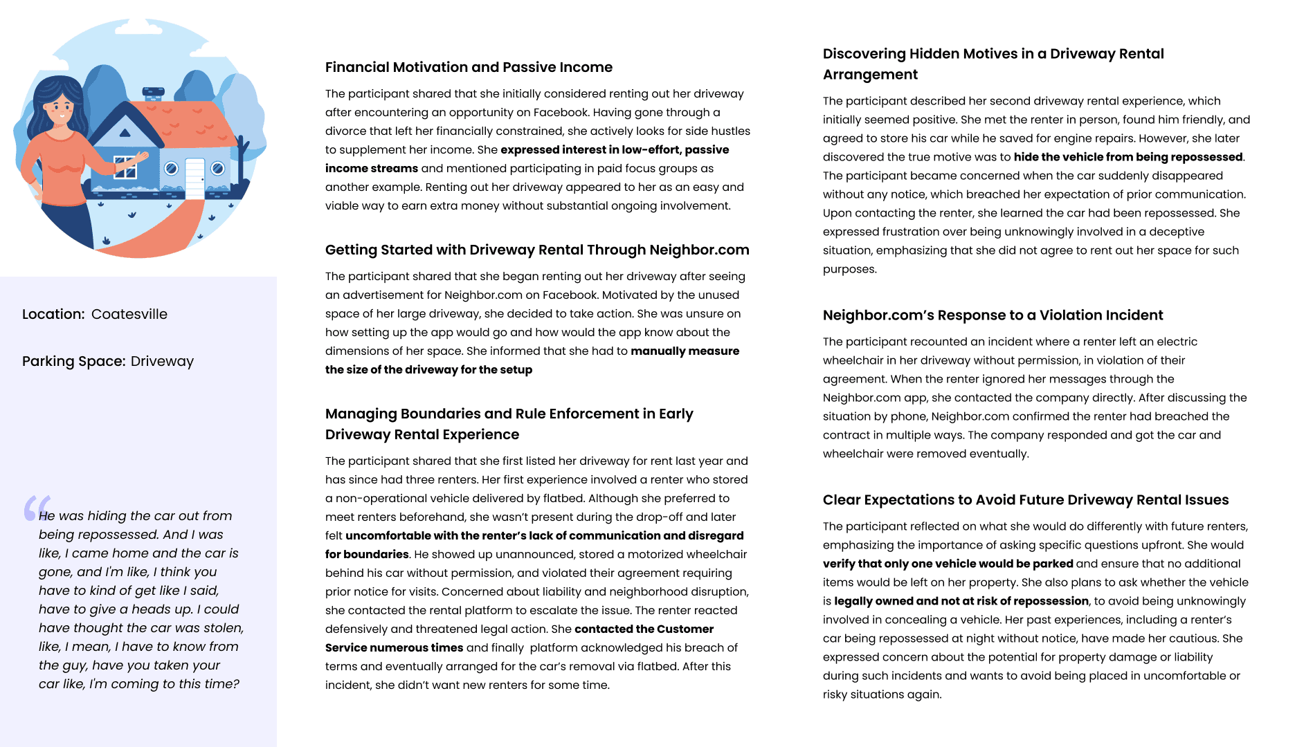 At the same time, I spoke to homeowners who had unused driveways or garages. While many were open to the idea of renting their space, most of them had never actually done it. Their feedback was hypothetical and based on assumptions, not lived experience. This made me realize that although their opinions were useful, they were not the right users to deeply understand real problems.
